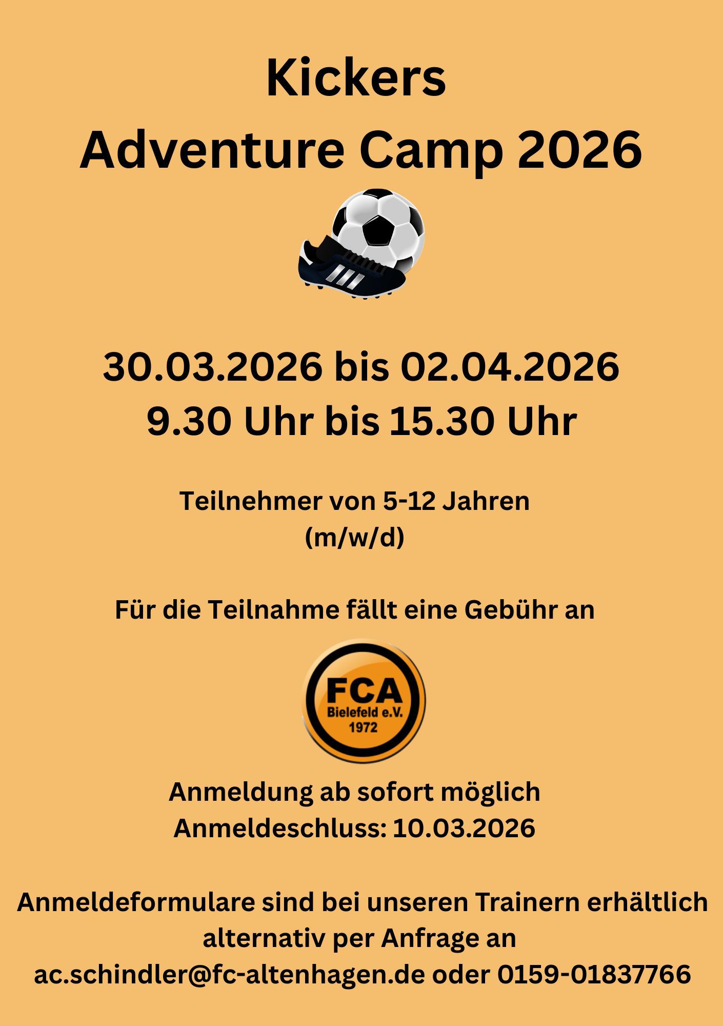 Auch dieses Jahr findet in der ersten Osterferienwoche vom 30.03.-02.04.2026 das Kickers-Adventure-Camp statt. Es können wieder alle Kinder von 5-12 Jahren teilnehmen unabhängig von einer Vereinsmitgliedschaft. Es dreht sich natürlich alles rund um den Fußball, aber nicht nur.